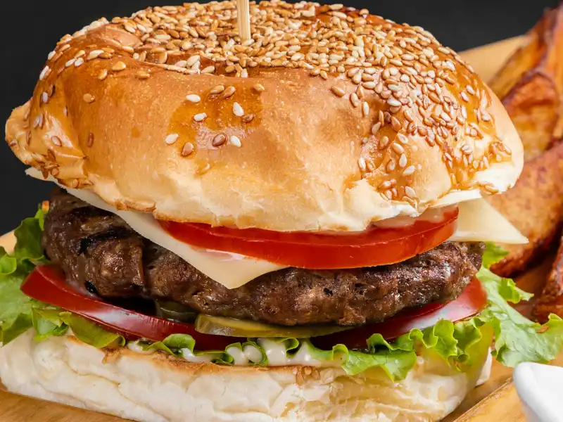 • Beef burger grilled, cheese, tomato, cucumber and french fries
